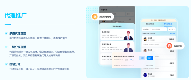 支持多级代理管理实现一键分享、快速裂变。配备独家防抢客功能代理&客户关系绑定,保障代理权益。