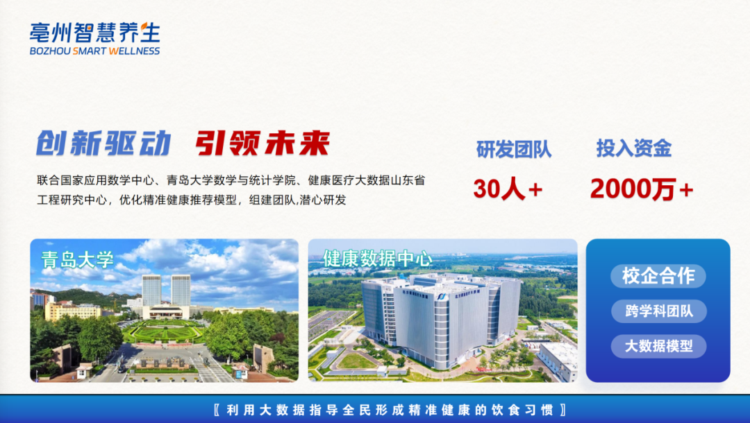 技术创新是亳州智慧养生的核心竞争力。公司打造的中医健康多维动态大数据模型,是精准饮食服务的核心技术支撑。为持续优化精准健康推荐模型,联合国家应用数学中心、青岛大学数学与统计学院、健康医疗大数据山东省工程研究中心,组建30余人研发团队,投入资金超过2000万元,让传统养生智慧实现科技化、精准化落地。