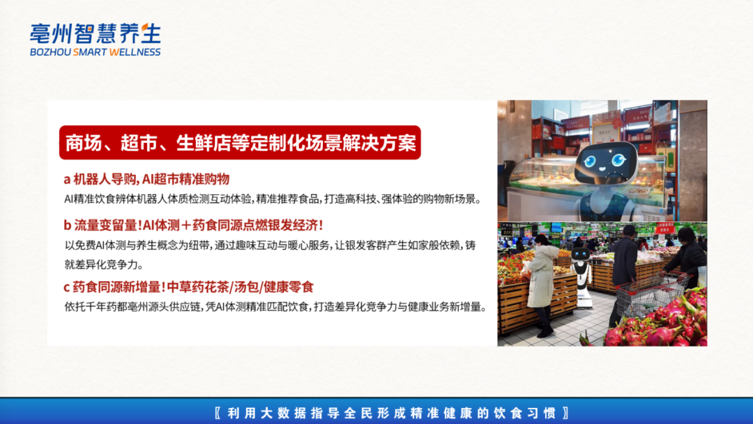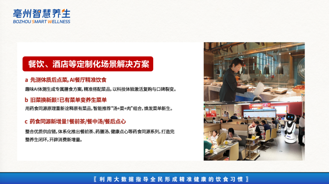 同时,公司聚焦行业赋能,为餐饮、酒店、超市等传统行业提供定制化场景解决方案。在餐厅、酒店场景中,创新推出“先测体质后点菜”的AI餐厅精准饮食服务,根据用户体质智能搭配菜品;在超市场景中,借助机器人导购实现AI超市精准推荐,为顾客筛选适合其体质的食品。通过系统与多元场景的深度融合,助力传统行业转型升级,提升差异化竞争力,挖掘“药食同源”新流量密码,推动精准健康饮食理念在各行业落地生根。